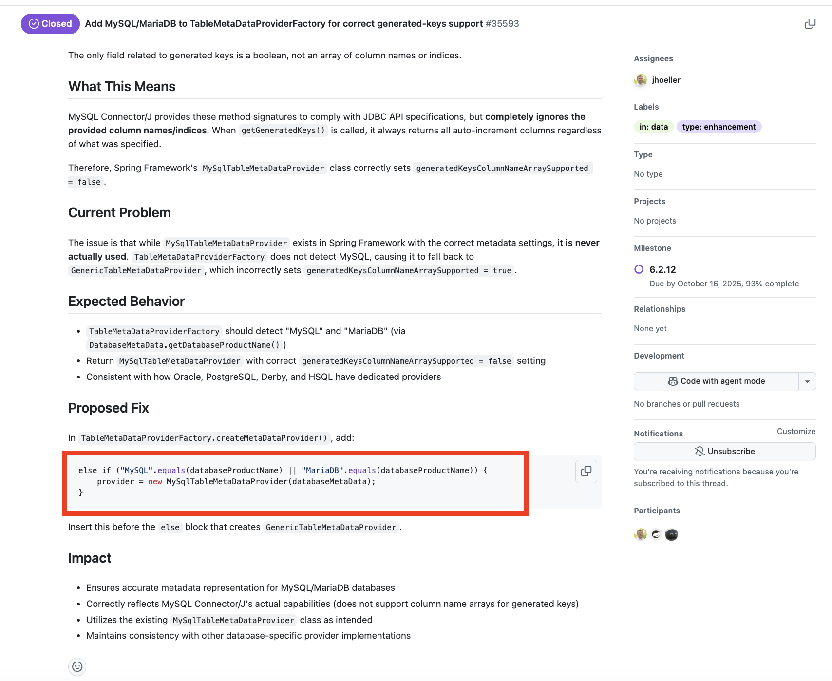 Spring Framework에 이슈를 제기하고 받아들이기 위해서는 "혼란을 없애기 위해 추가 클래스가 필요하다"는 가정만으로는 부족했습니다. MySQL Connector/J의 StatementImpl.java 소스 코드를 분석하여, 컬럼명 배열이 boolean으로만 변환되고 실제 배열은 버려진다는 구체적인 증거를 확보했습니다.