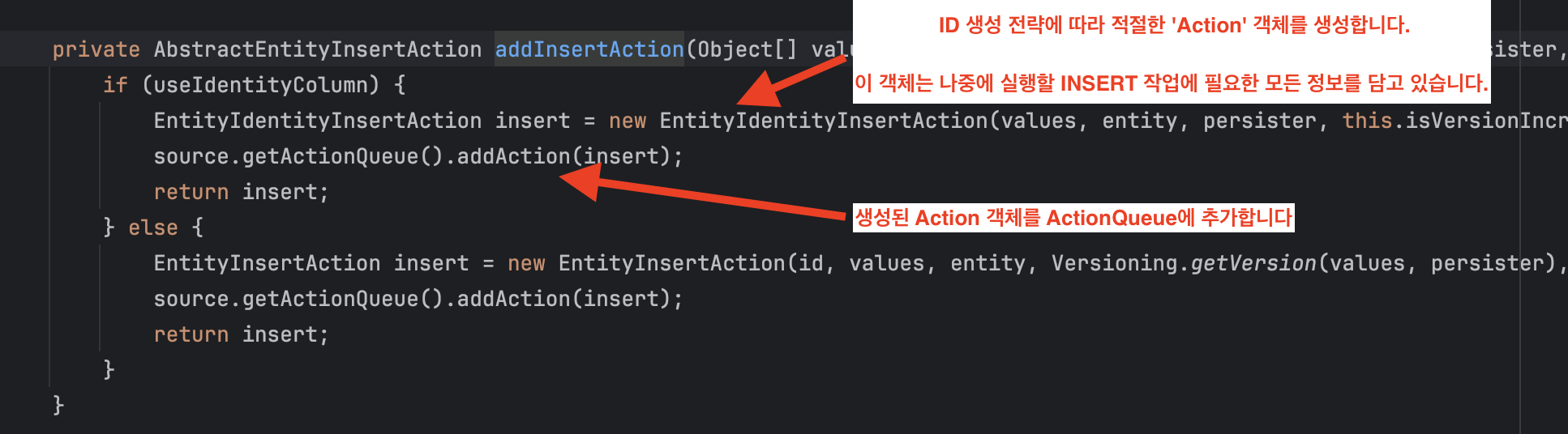 - 실제 INSERT SQL은 내부 쿼리 저장소(Action Queue)에 "쓰기 지연(Transactional Write-Behind)" 상태로 쌓입니다.