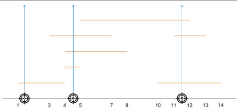 주황색은 폭탄이 날라가는 구간이다. 우린 이 폭탄을 미사일로 요격해야 한다. 이때 최소로 필요하는 요격 미사일 개수를 구하면 되는 문제다.