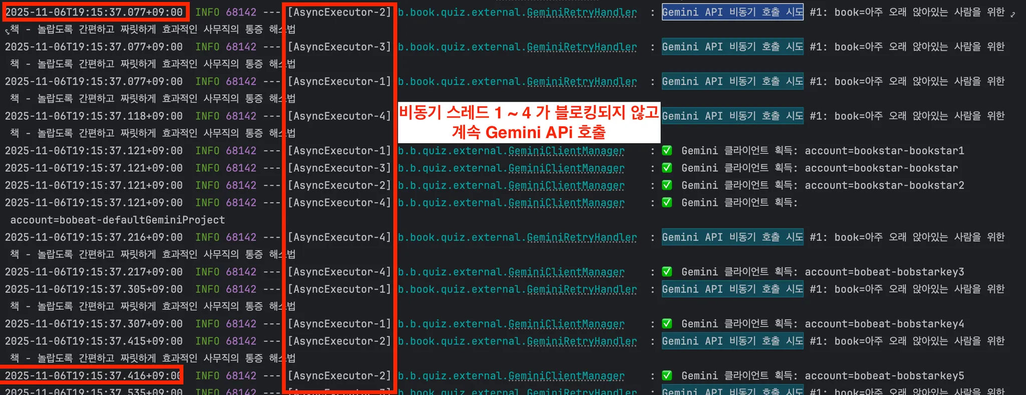 @Async 스레드 풀(MaxPoolSize: 4)은 1분간의 I/O 대기를 수행하는 것이 아니라, 100ms 미만의 작업 등록하고 즉시, 또 다른 요청의 AI 요청을 보냅니다.